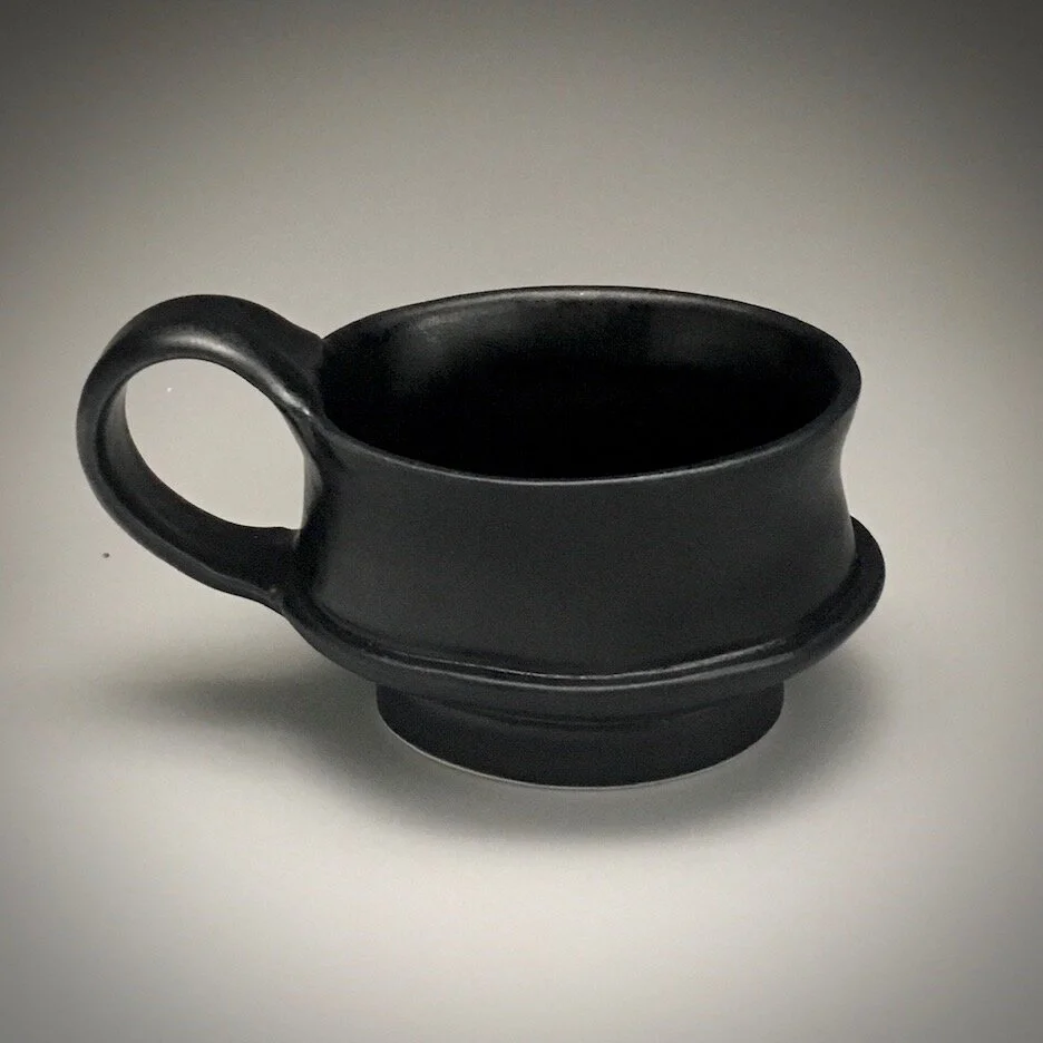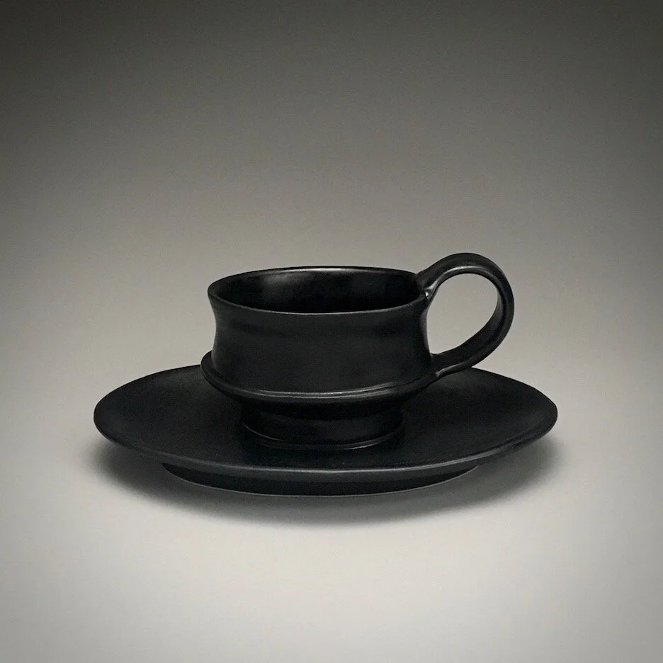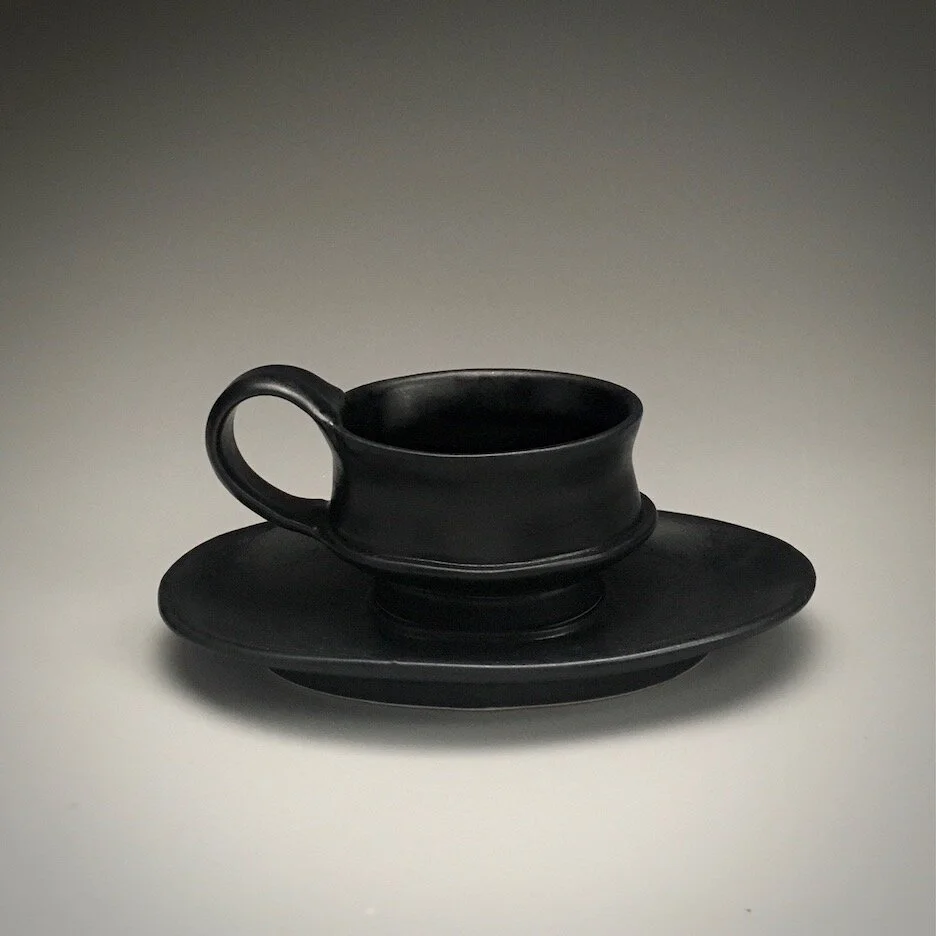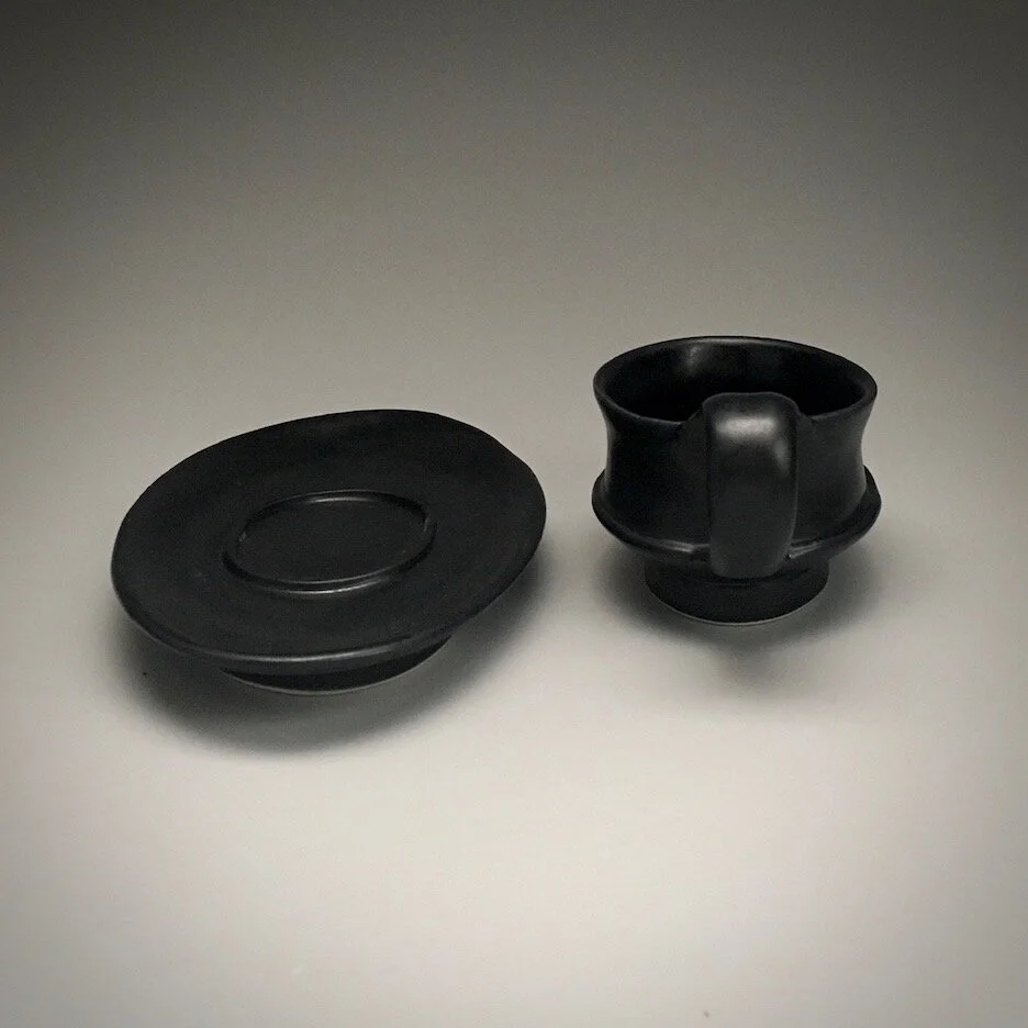 Etruscan pottery inspires this form, with curves and counter curves I think are enticing and elegant. The saucer on this cup is larger and elevated just a little. Holds a double shot- 2 ounces with room for foam.