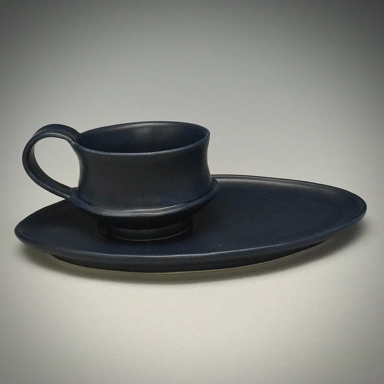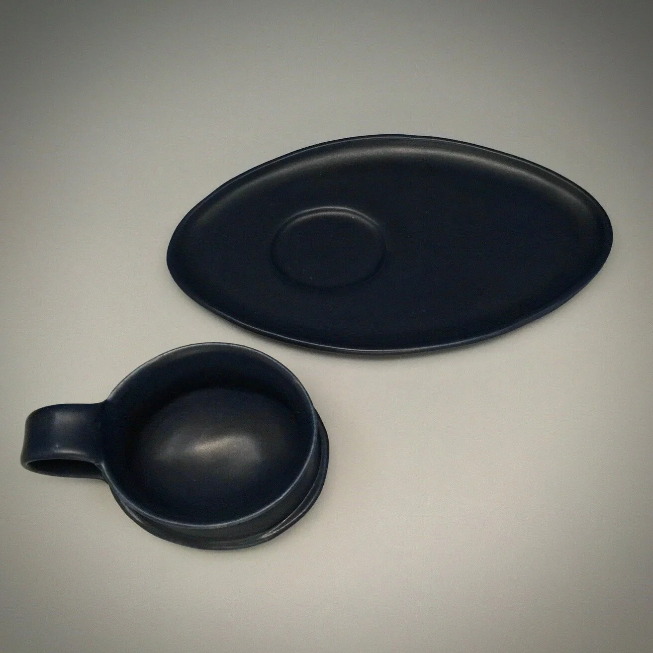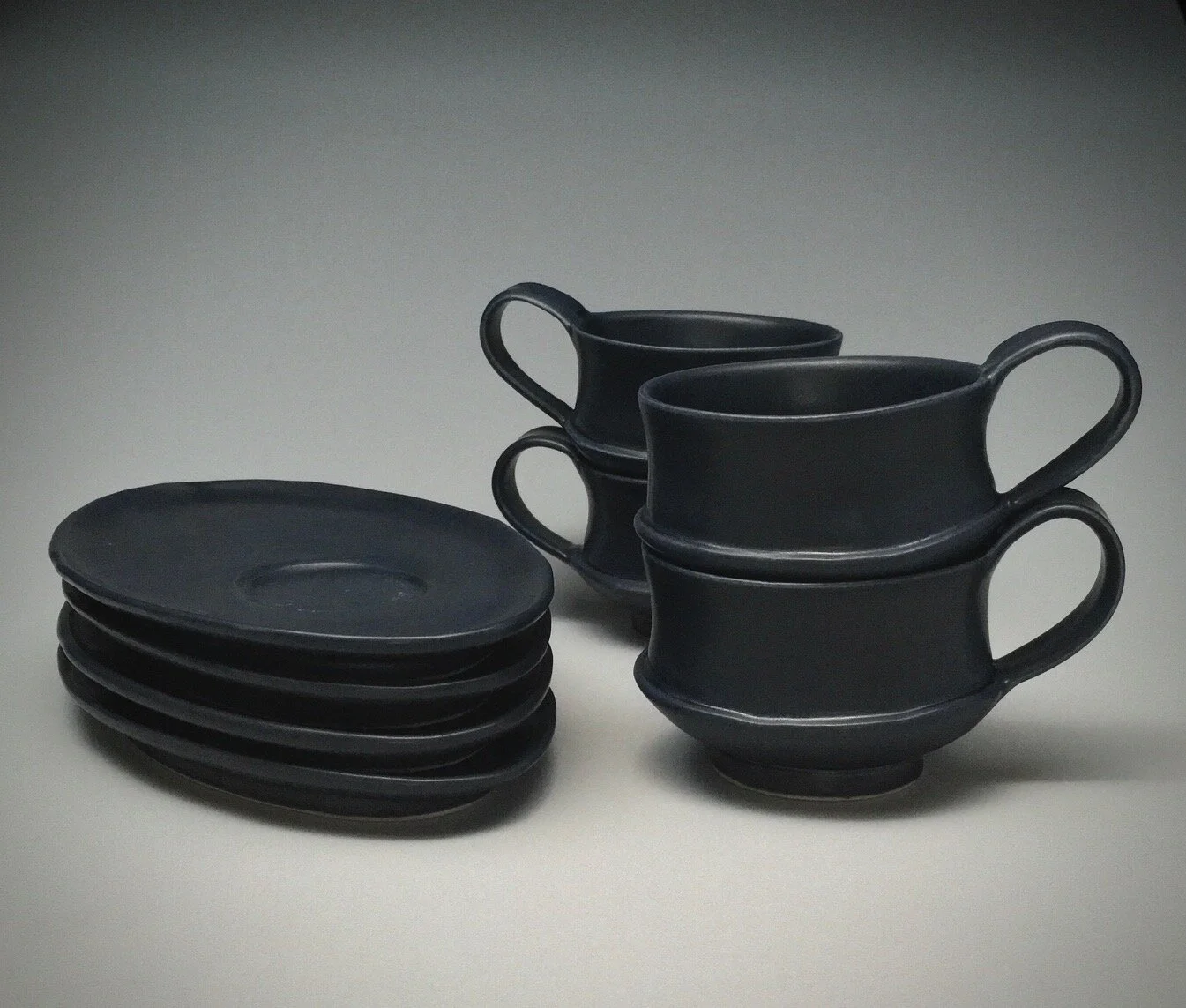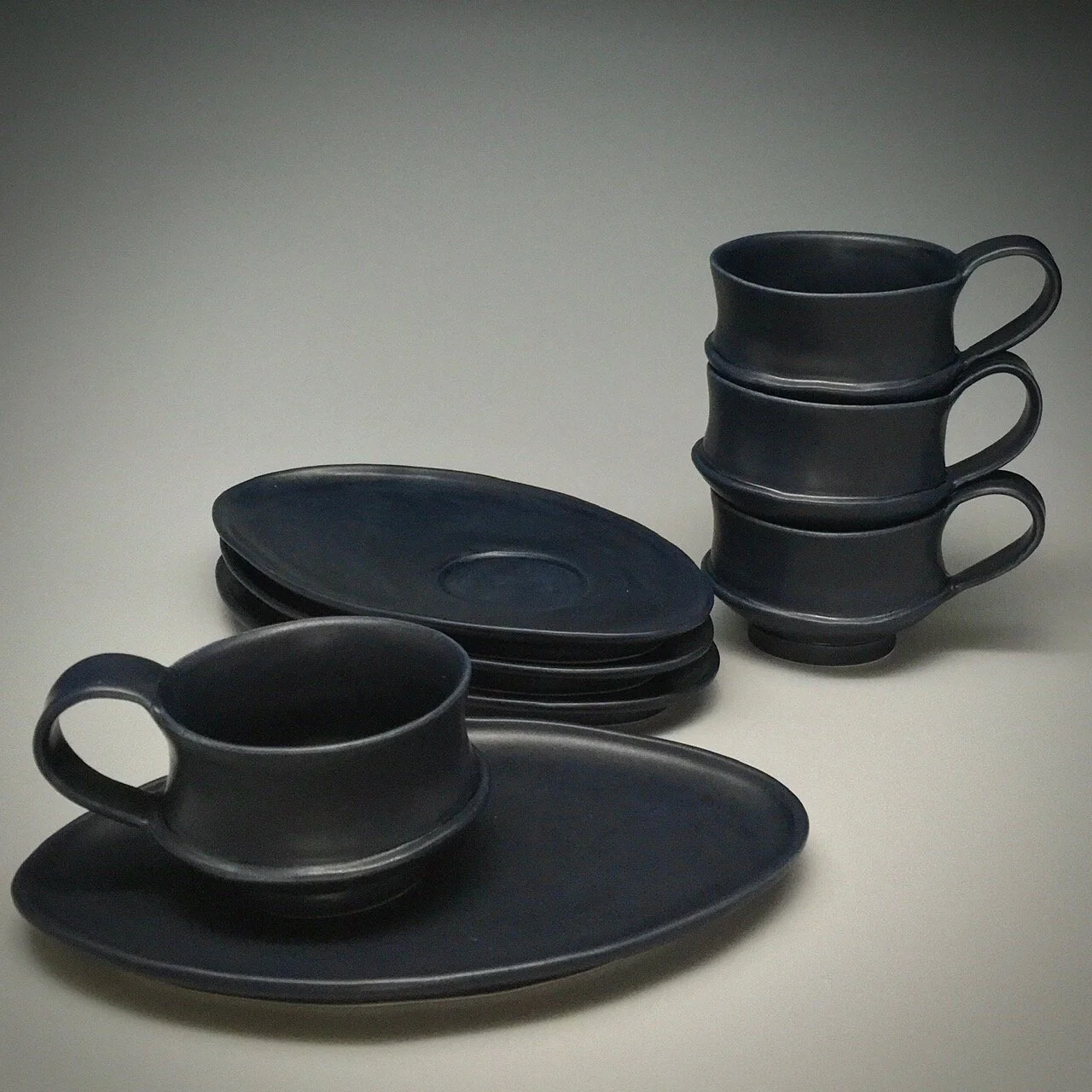 Glazed a deep midnight blue matte, this set of four cups with saucers have generous round handles. The off-set saucer has a recessed oval for the cup to rest in, leaving room on the side for a spoon and a sweet treat.