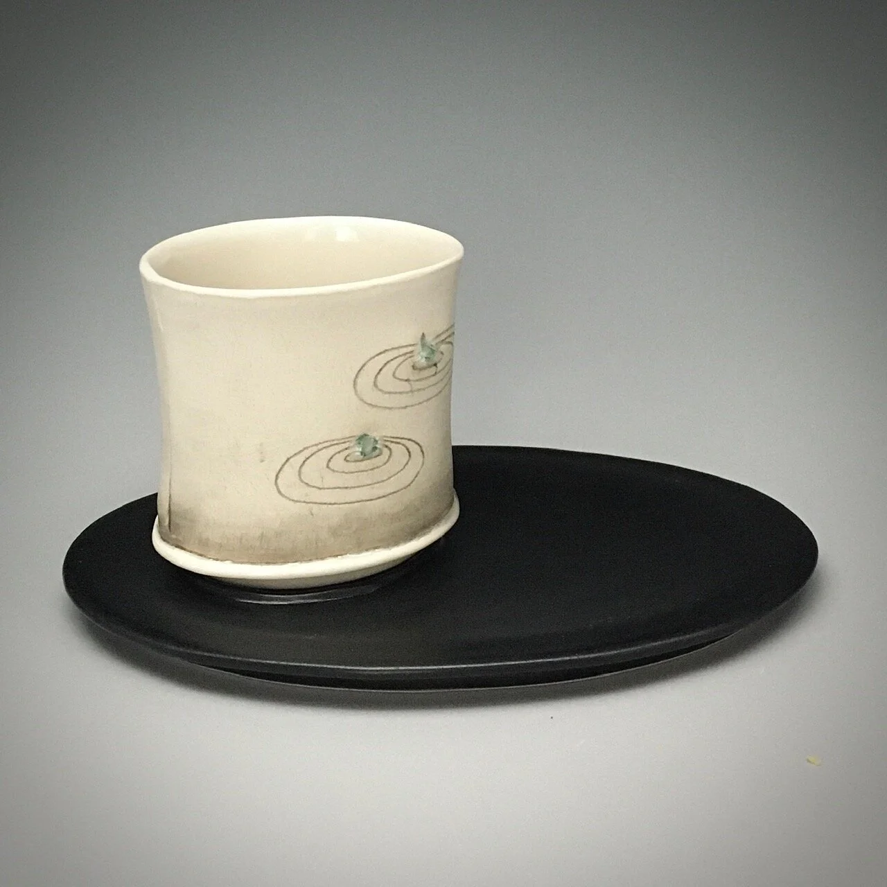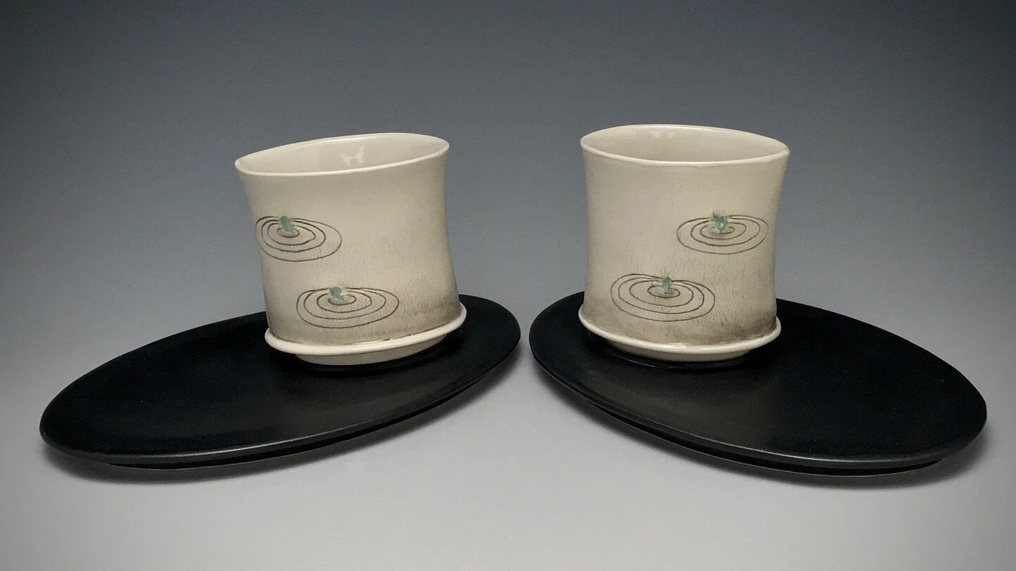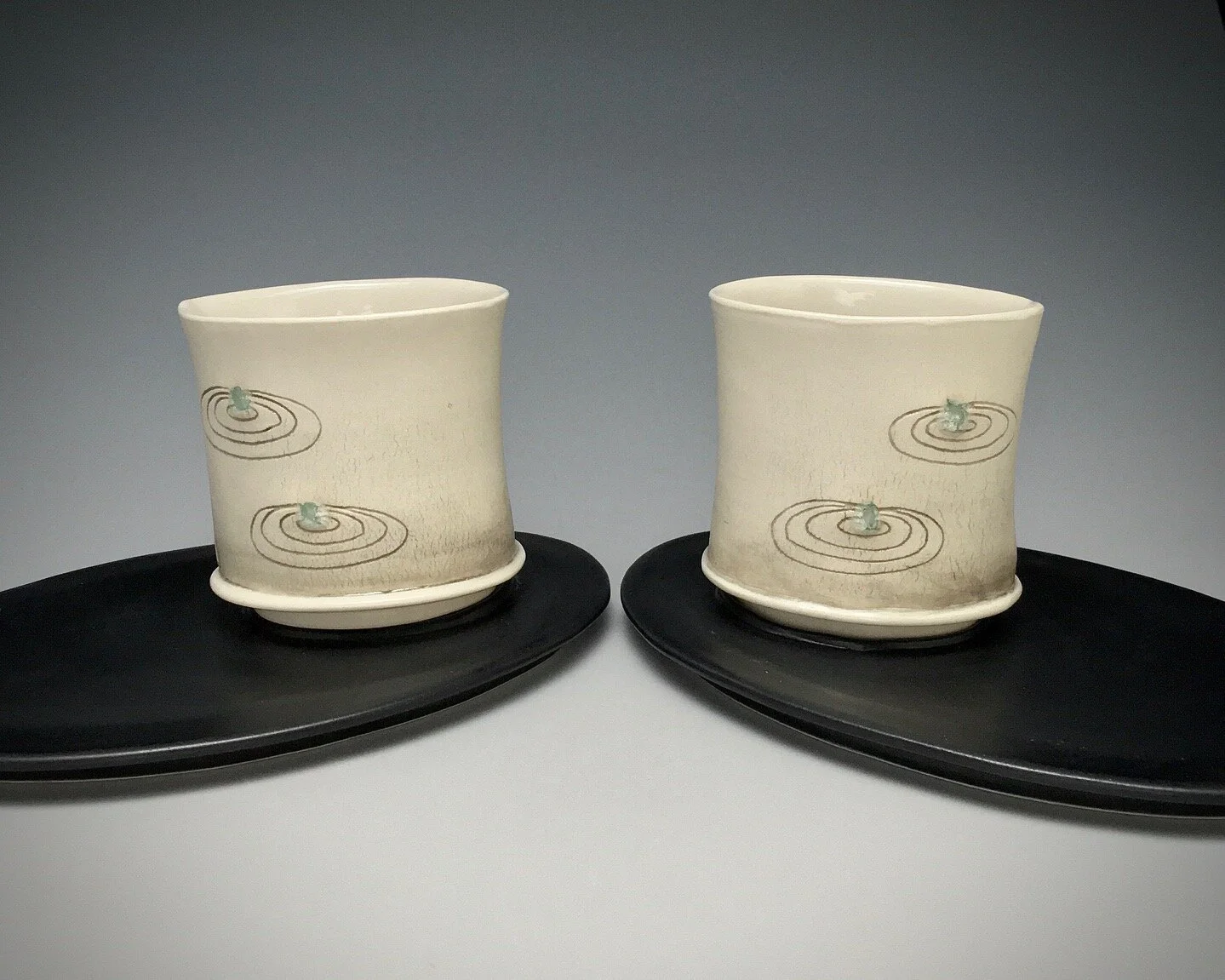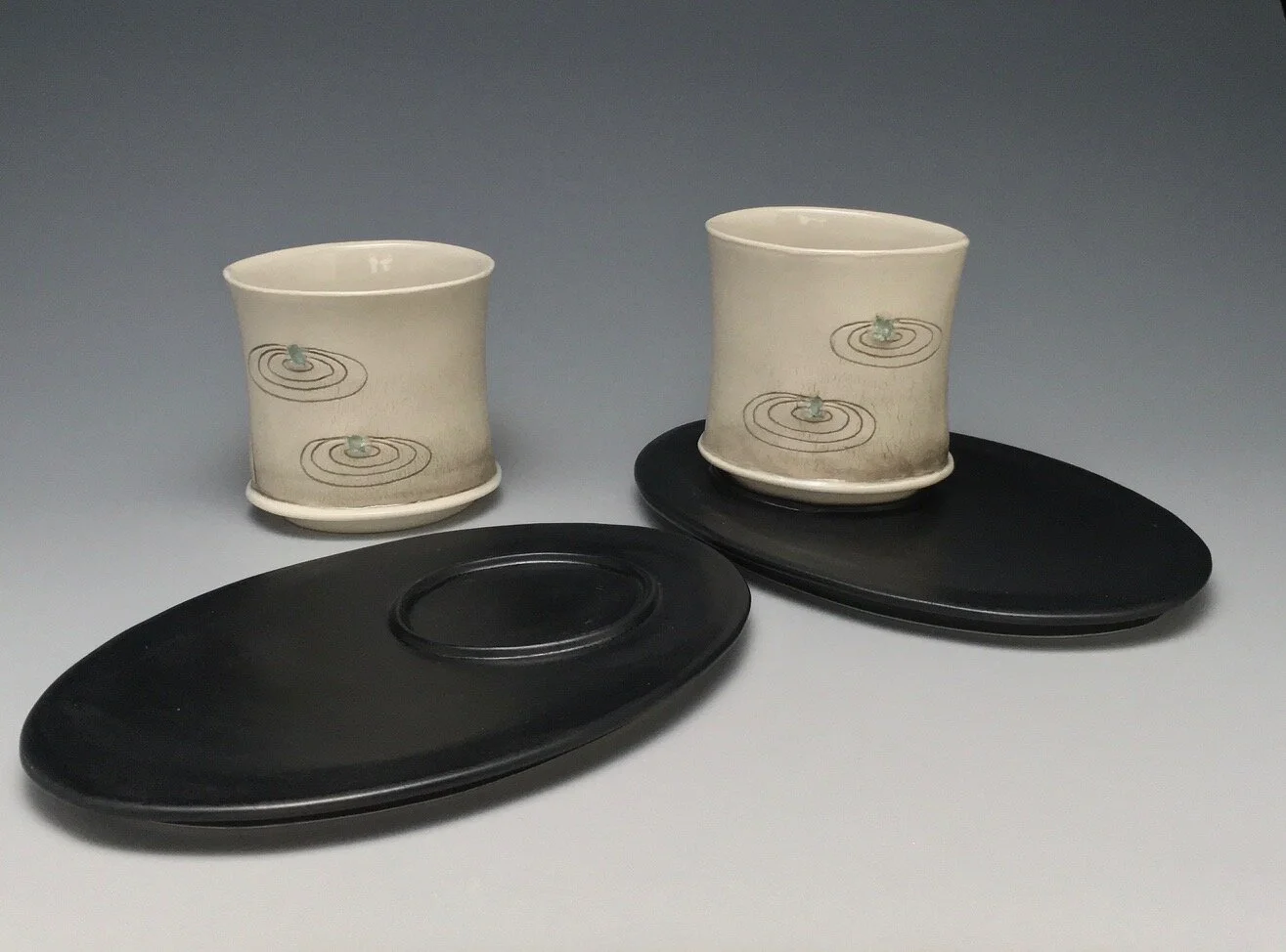 Yunomi are low drinking cups without handles. These are meant for tea or a cocktail, and the flat saucers mirror each other with raised ovals to hold the drinks in place.