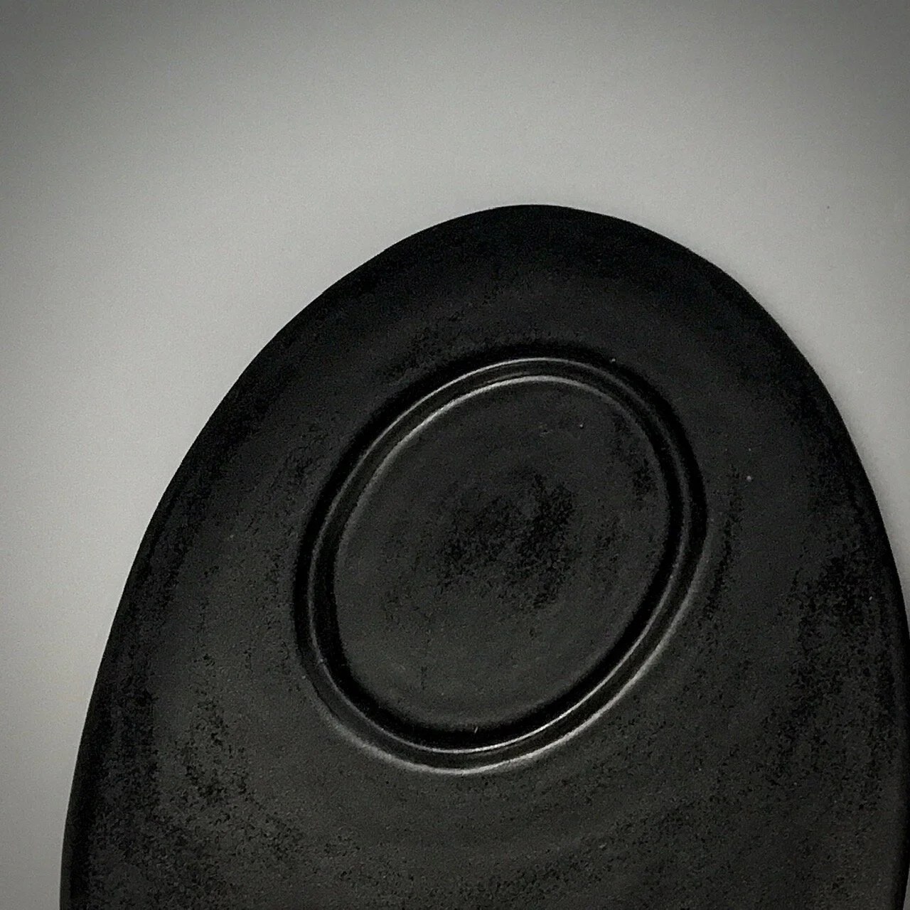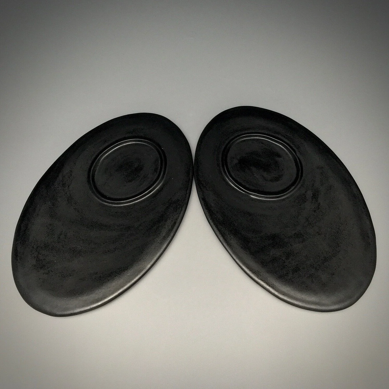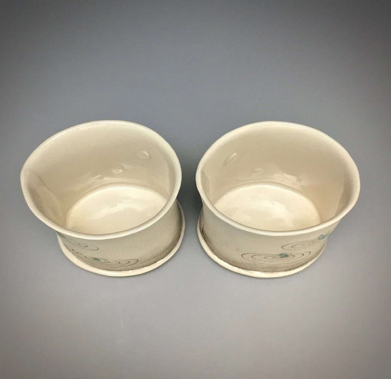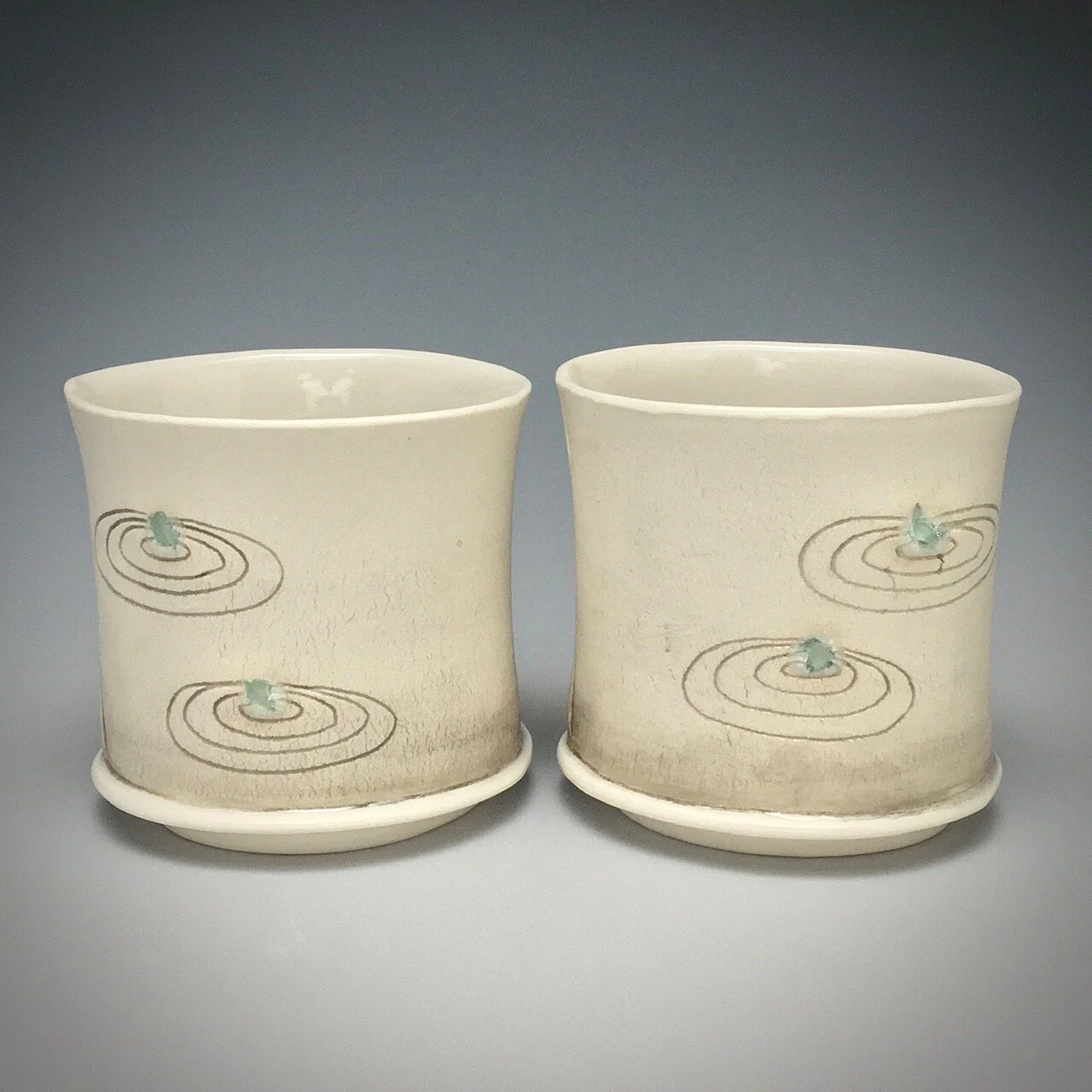 Yunomi are low drinking cups without handles. These are meant for tea or a cocktail, and the flat saucers mirror each other with raised ovals to hold the drinks in place.