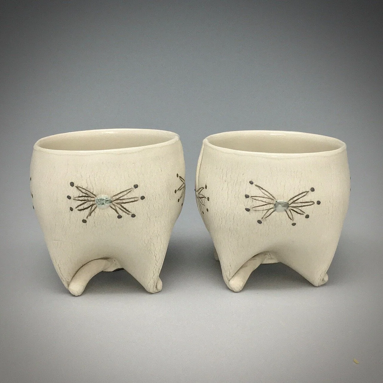 Pinwheel rolled feet create a sensation of rotation in these little wine cups. Light and full of volume, the tactile surface is animated with sgraffito drawing and fused glass inlay.