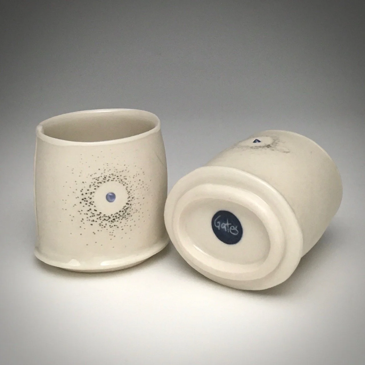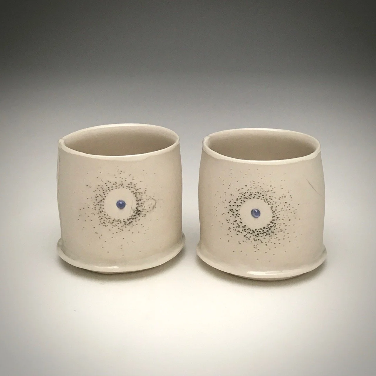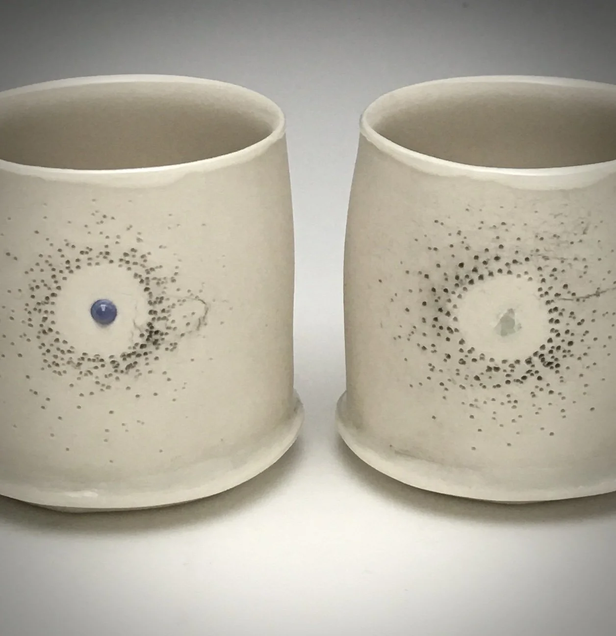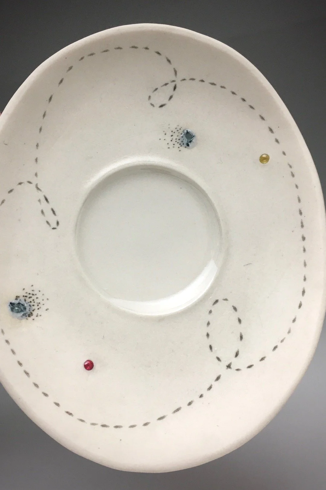 All pots are porcelain, hand built one at a time. Intuitive designs are inscribed into the surface, and accented with fused glass inlay. Not recommended for use in the microwave, and washing by hand is best.