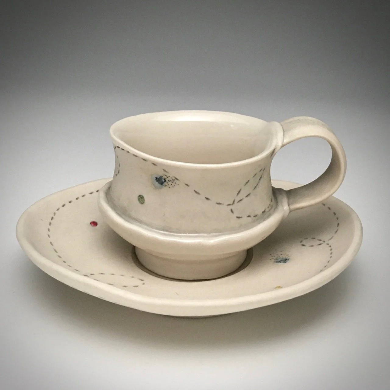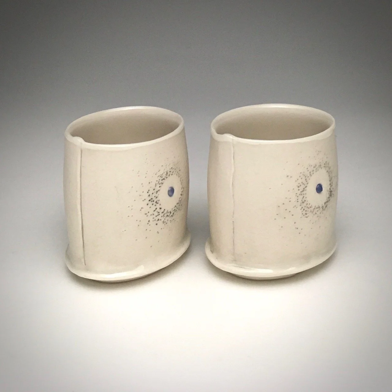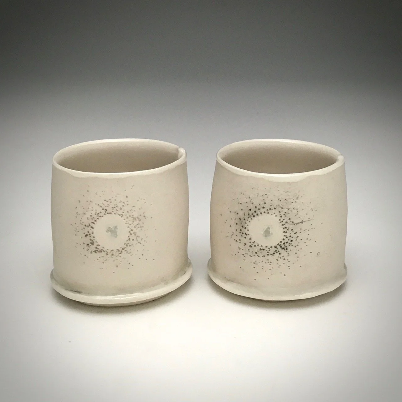 All pots are porcelain, hand built one at a time. Intuitive designs are inscribed into the surface, and accented with fused glass inlay. Not recommended for use in the microwave, and washing by hand is best.