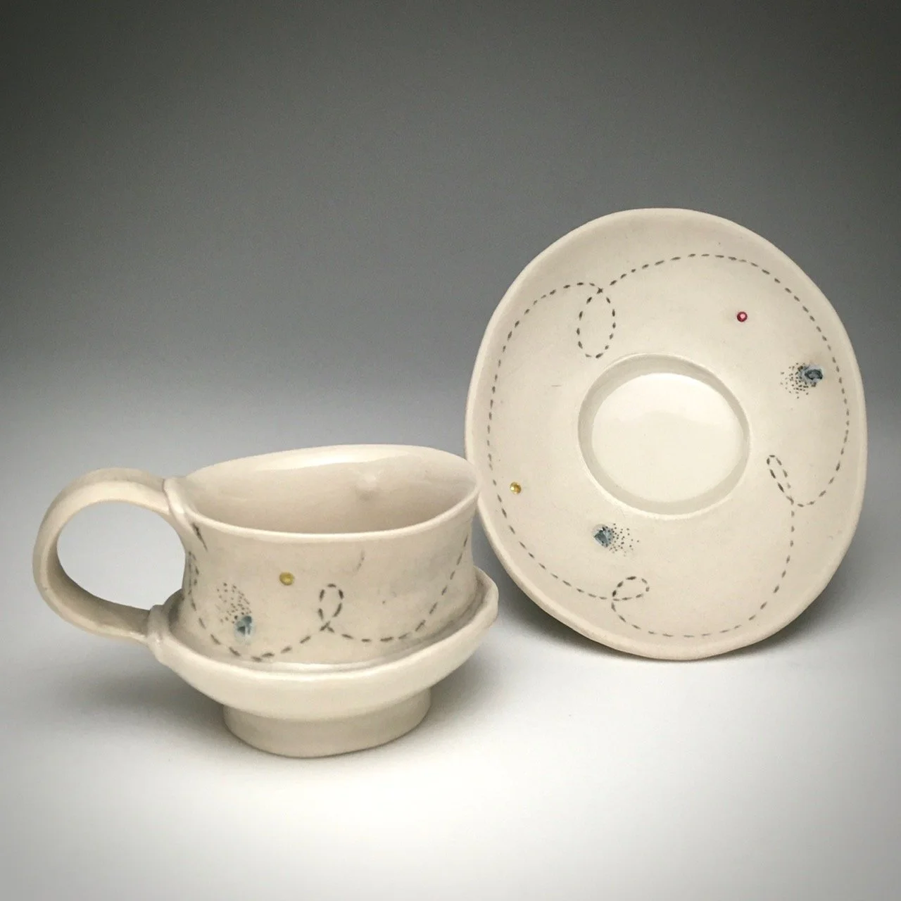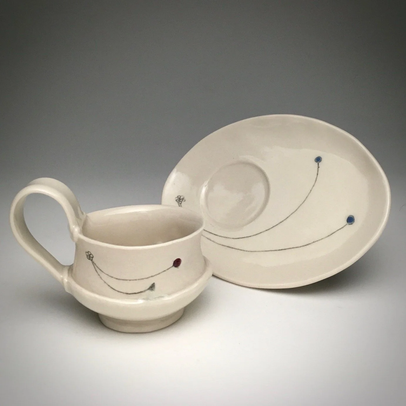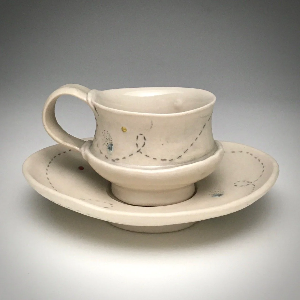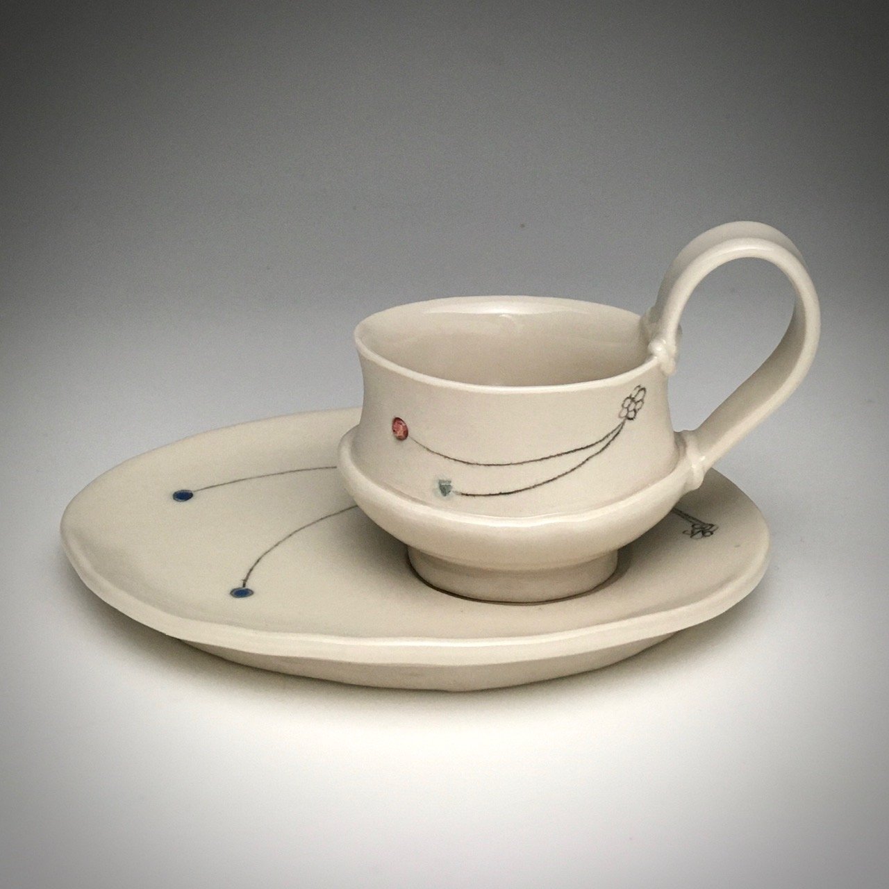 All pots are porcelain, hand built one at a time. Intuitive designs are inscribed into the surface, and accented with fused glass inlay. Not recommended for use in the microwave, and washing by hand is best.